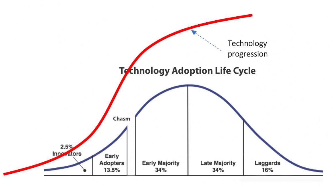 Where are most businesses today in terms of generative AI adoption? Each business and industry fits on a range in terms of their readiness to adopt AI: The innovators try the latest novel technology on the bleeding edge; early adopters follow close behind; the majority wait to see how others do before diving in. This model of the adoption cycle is shared below.