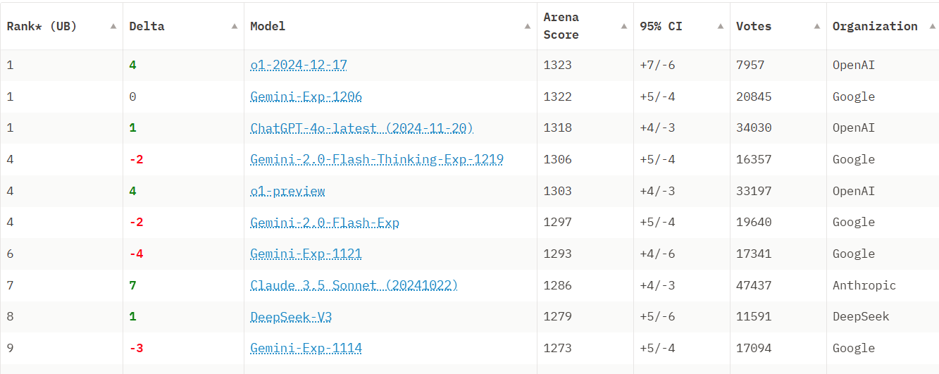 Finally, Google’s Gemini 2.0 release and their other powerful model releases last month (Veo2, Imagen 3, etc.) broke the spell of being over-shadowed by OpenAI. Gemini 2.0 models took top positions on the LLM Arena leaderboard, with Gemini-Exp-1206 aka Gemini 2.0 Advanced holding the leading position (still holding as of Jan 20th, 2025). Google now offers a best-in-class AI model across a range of tasks.