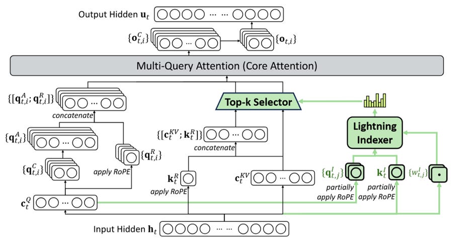 DeepSeek Sparse Attention (DSA) achieves its improved efficiency in attention by dynamically selecting relevant tokens rather than processing the full sequence. A “Lightning Indexer” in DeepSeek Sparse Attention scans for the top relevant tokens rather than the entire context. This significantly reduces pre-filling and decoding costs for large contexts while maintaining quality. (It reduces attention computational complexity from quadratic on the context size L to O(𝐿𝑘), where 𝑘 (≪ 𝐿) is the number of selected tokens.)
