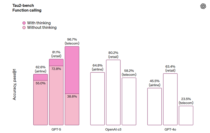 Agentic AI and tool use: GPT‑5 shows strong instruction following and tool use, with 81% on Tau2-Bench retail and 54% on BrowseComp; both are improved over o3.