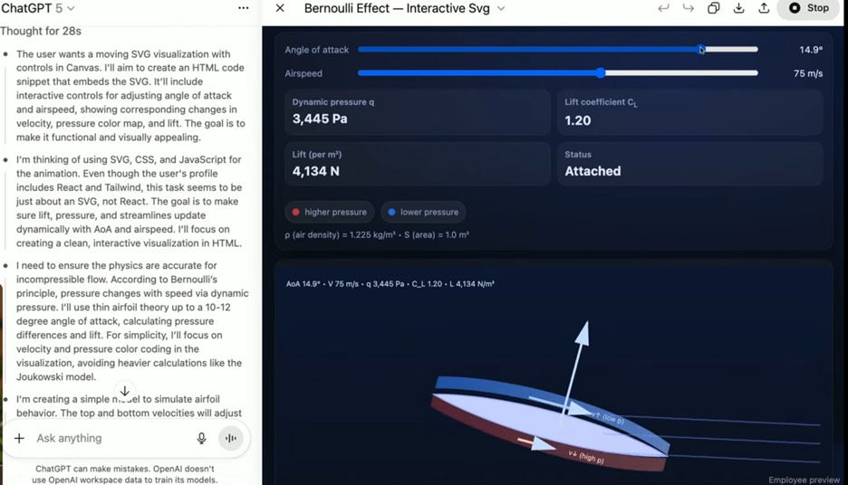 Coding for Learning: They used GPT-5 to ‘vibe-code’ an interactive SVG animation to explain the Bernoulli effect, a task that would have taken a human developer a week.