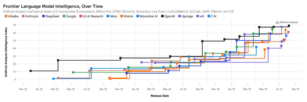 Intelligence: GPT‑5 hits 65.7% on ARC‑AGI‑1 and 9.9% on ARC‑AGI‑2; Grok‑4 leads ARC‑AGI‑2 at 15.9%.