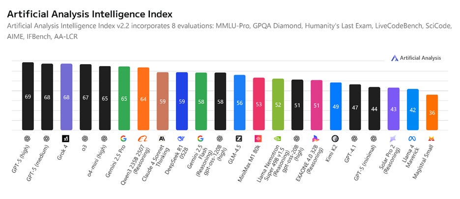 The Artificial Analysis intelligence ranking sums up the benchmarks overall, showing GPT-5 lives up to billing as the current world’s smartest AI model, slightly ahead of Grok 4, o3, and Gemini 2.5 Pro.